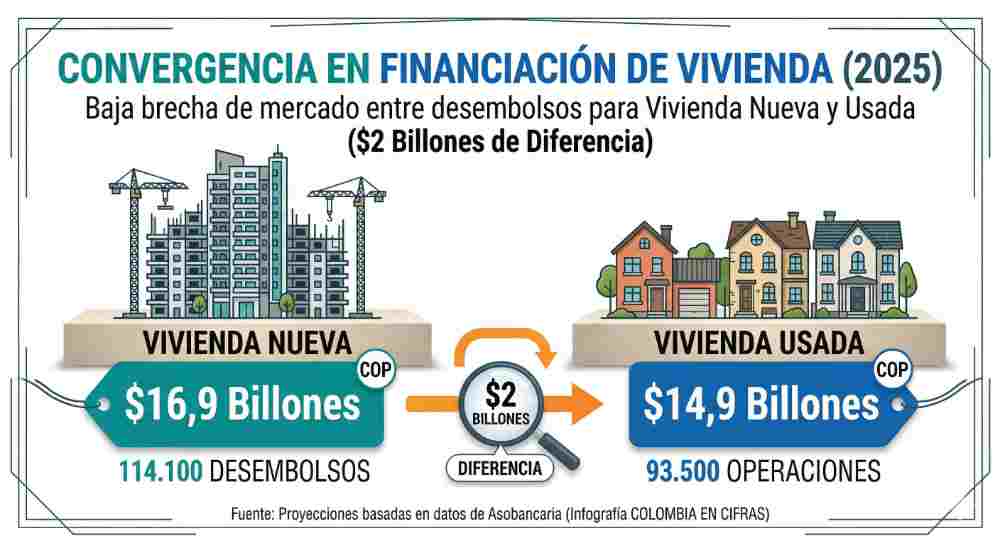 En términos de valor transaccional, se observa una convergencia entre los mercados de inmuebles nuevos y usados; mientras el segmento nuevo movilizó $16,9 billones (114.100 desembolsos) —cifra impulsada por la entrega de proyectos comercializados entre 2023 y 2024—, el mercado de vivienda usada demostró una notable resiliencia al alcanzar los $14,9 billones a través de 93.500 operaciones. Este fenómeno sugiere que, ante la ralentización en las iniciaciones de obra nueva, la demanda se ha desplazado hacia el inventario existente para compensar el déficit de oferta.