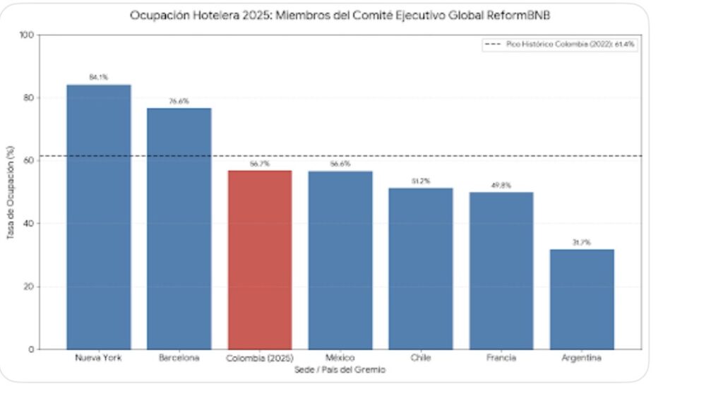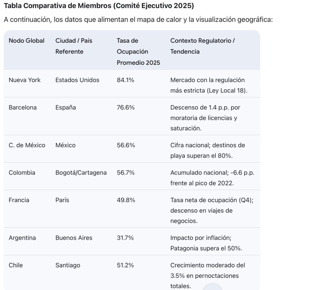 El ingreso de Cotelco a este comité ejecutivo es una respuesta a la erosión de los márgenes de ocupación en mercados maduros y emergentes. Mientras destinos como Nueva York mantienen tasas altas mediante restricciones severas al alquiler de corta estancia (Ley Local 18), mercados como Colombia y Francia registran presiones que mantienen sus niveles de ocupación por debajo de los promedios históricos.