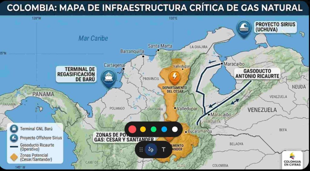 Ante este panorama, el gremio ha identificado 10 proyectos estratégicos, destacando el Proyecto Sirius en el mar Caribe, que tiene el potencial de abastecer el 45% de la demanda nacional pero cuya operación para 2030 depende de concluir las consultas previas con 120 comunidades en 2026. Complementariamente, se plantea la rehabilitación del Gasoducto Antonio Ricaurte para importar gas desde Venezuela —aunque supeditado a la firma de contratos comerciales— y la habilitación de yacimientos no convencionales en el sur del Cesar y norte de Santander, donde se estima la existencia de recursos 10 veces superiores a las reservas probadas actuales.