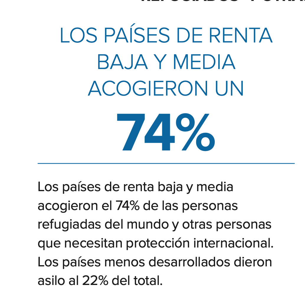 En 2022, el número de personas desplazadas por la fuerza debido a persecución, conflicto, violencia, violaciones a los derechos humanos y acontecimientos que alteraron gravemente el orden público creció en un 21%, lo que representó un estimado de 108,4 millones para finales de año. Como resultado, más de 1 de cada 74 personas a nivel mundial permanecieron desplazadas por la fuerza,14 y casi el 90% se encontraba en países de renta baja y media.