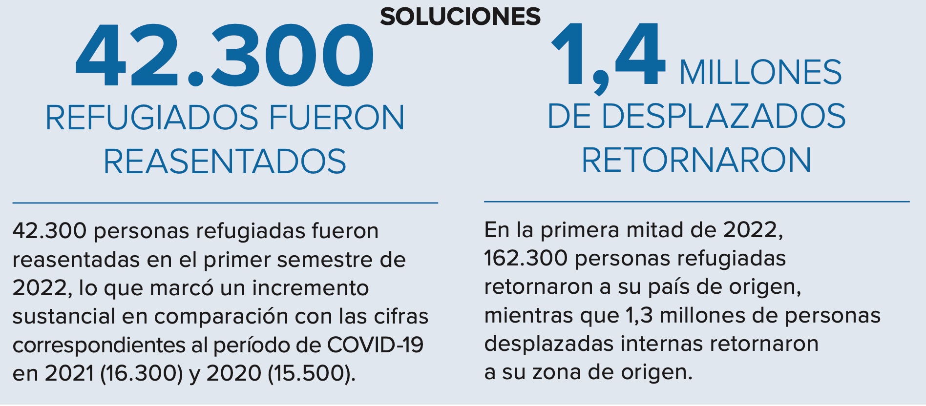 Más de la mitad del aumento fue producto de cifras récord de personas refugiadas, solicitantes de asilo y otras personas que necesitan protección internacional que se vieron forzadas a huir en 2022 . Durante los primeros cinco meses de 2023, el desplazamiento forzado continuó aumentando, y ACNUR estima que es probable que la cifra global exceda los 110 millones de personas al momento de la redacción de este informe, en mayo de 2023.