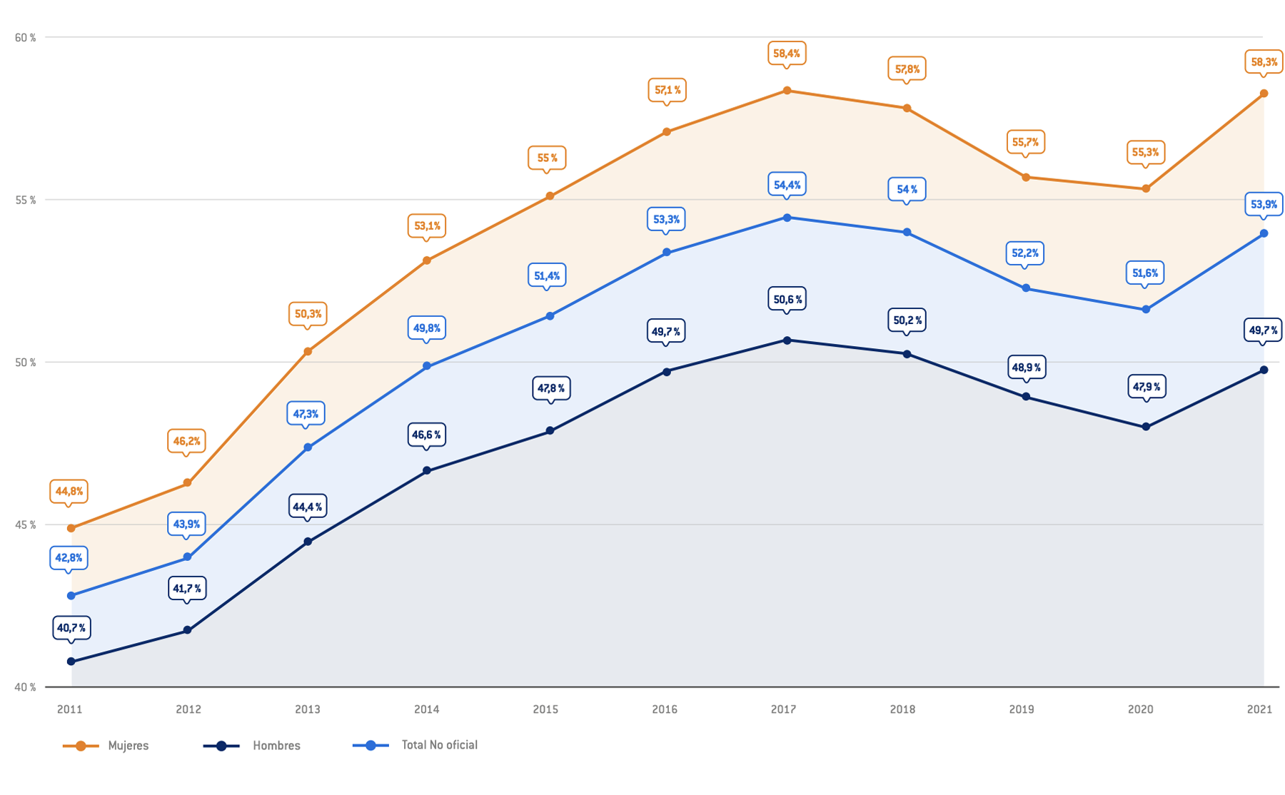 Informalidad: Si bien ha bajado la tasa de desempleo en los últimos años, preocupa la calidad del empleo recuperado. La tasa de informalidad ha venido en aumento desde el 2019 y no se ha podido recuperar, al 2021 era del 60%.