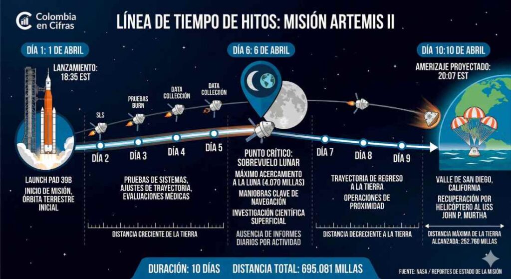 La misión Artemis II contempla una duración operativa de 10 días, durante los cuales la nave Orion recorrerá una distancia total de 695.081 millas (1.118.621 kilómetros) entre el lanzamiento y su retorno.